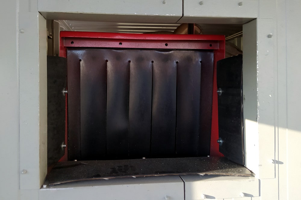 Angesicht des Arbeitsschutzes ist die ganze Technologie (Shredder, Entstaubungsanlage, Magnetabscheider, Metalldetektor) durch Klapptüren abgetrennt, so dass lediglich die Öffnung für das Einlegen des Materials in den Shredder offenliegt.