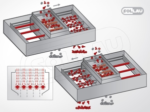 Der automatische Kastenabscheider besteht aus mehreren übereinanderliegenden Magnetkernen (in schützenden Edelstahlgehäusen). Die einzelnen Röhrenreihen/Roste - enthalten abwechselnd ungerade und gerade Anzahl von Magnetröhren. D. h., dass sich über dem Spalt zwischen zwei Röhren des Unterrostes eine Magnetröhre des Oberrostes befindet. Dank dieser Anordnung fällt das gereinigte Material kaskadenförmig quer ein dichtes Rostsieb durch, wobei ein extrem starkes Feld von Neodym-Magneten alle magnetischen Partikeln auf der Oberfläche der Abdeckrohre einfängt. Der gesamte Abscheider besteht aus Edelstahl nach DIN 1.4301, was eine hohe Widerstandsfähigkeit und lange Lebensdauer garantiert. Gleichzeitig handelt es sich um ein Gerät, das mit geringem Platzbedarf für den Einbau in vorhandene Verarbeitungslinien geeignet ist.